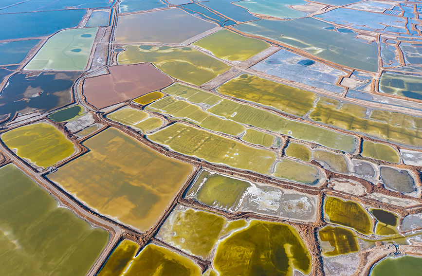 冬日時(shí)節(jié),隨著氣溫降低,山西運(yùn)城鹽湖湖面上,色彩斑斕、景色如畫(huà)。芒硝結(jié)晶,“硝花”似雪,鹽湖里各種線(xiàn)條和幾何圖案,猶如大自然的調(diào)色盤(pán),十分迷人。