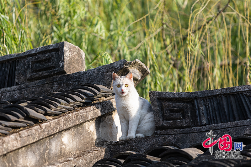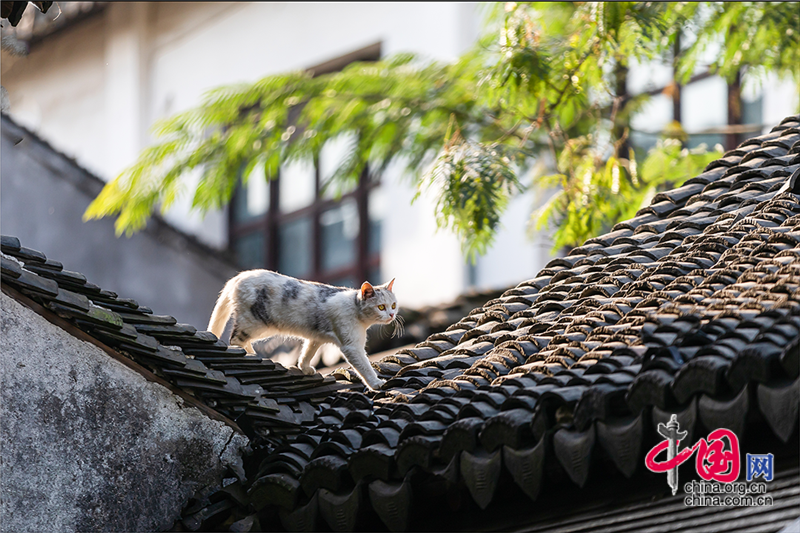 在毛孩子眼里,這就是包容一切活動(dòng)的「游樂場(chǎng)」,片片青瓦上留下梅花印?;蛟S你也該往古鎮(zhèn)的屋頂上瞧,檐角翹伸、清風(fēng)古韻,讓人心曠神迷?;蛲侵回堃粯优噬细咛帲拼翱茨撬菢?,那木門青瓦,就是江南水鄉(xiāng)的具象。
