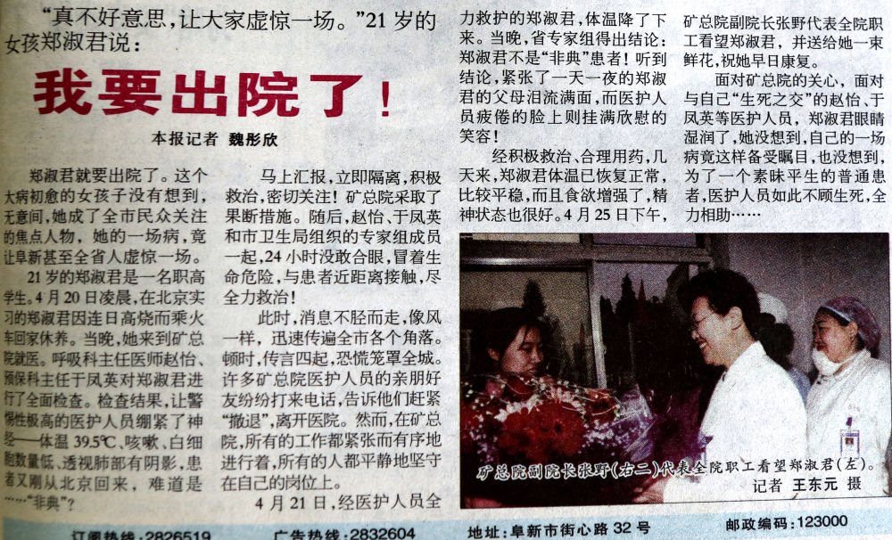 作為部門(mén)領(lǐng)導(dǎo),她依然表現(xiàn)出色,2003年“非典”期間,她擔(dān)任阜新晚報(bào)要聞部主任,她提出“最危險(xiǎn)的地方,我先上!”4月20日,有一個(gè)學(xué)生從北京回來(lái),因?yàn)楦邿煌吮粦岩蔀楦腥?ldquo;非典”,一時(shí)間謠言四起,恐慌籠罩全城,魏彤欣一個(gè)人冒著風(fēng)險(xiǎn)深入醫(yī)院跟蹤采訪,在得知確診不是“非典”后,第一時(shí)間發(fā)出了報(bào)道《我要出院了》,及時(shí)消除了公眾恐慌情緒。她帶領(lǐng)記者深入發(fā)熱門(mén)診、城市出入口的檢查站和醫(yī)護(hù)人員之間,掌握了大量的一手材料,共采寫(xiě)了70余篇稿件,她本人被評(píng)為“遼寧省抗擊非典新聞宣傳先進(jìn)個(gè)人”,她所在的部門(mén)被評(píng)為“遼寧省抗擊非典新聞宣傳先進(jìn)集體”。
