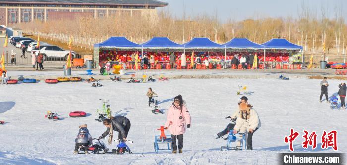1月7日,游人在敦煌文博冰雪場體驗(yàn)雪地游玩項(xiàng)目。王斌銀 攝