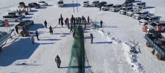 在克什克騰旗達里湖現(xiàn)場,人工鑿冰、冰下走網(wǎng),冬捕隊員在作業(yè)時選用5公分網(wǎng)眼,這樣捕魚時就能漏掉小魚。馬拉絞盤將大網(wǎng)拖拽出網(wǎng)口,滿載魚兒的漁網(wǎng)慢慢地從湖水中出來,游客們感受豐收的喜悅。