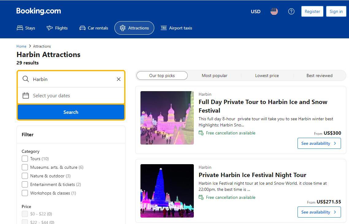 在酒店及住宿在線預(yù)訂平臺Booking.com上,可以搜索到近30個關(guān)于哈爾濱旅游的服務(wù)。其中,“哈爾濱冰雪節(jié)全日私人旅游”包括私人汽車和導(dǎo)游費(fèi)用,不包括門票收費(fèi)300美元,包括門票則收費(fèi)480美元。“哈爾濱冰雪節(jié)私人夜游”包括私人汽車、私人旅游、酒店接送、門票,收費(fèi)271.55美元起。