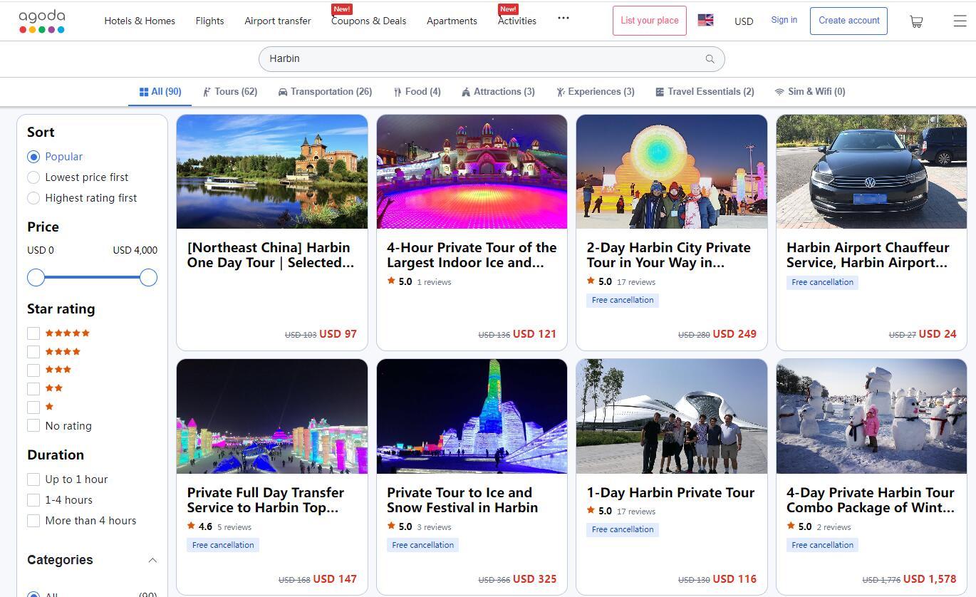 在線預(yù)訂平臺Agoda上也可以搜索到數(shù)十個關(guān)于哈爾濱旅游的服務(wù)。大約8小時的“哈爾濱一日游”,包括私人導(dǎo)游服務(wù)和用車費(fèi)用,收費(fèi)97美元起。為期2天的“哈爾濱市私人旅游”,包括私人導(dǎo)游服務(wù)、交通費(fèi)(私人汽車或公交車/出租車)、酒店接送,收費(fèi)249美元起。(中新網(wǎng)財(cái)經(jīng) 記者 吳家駒)