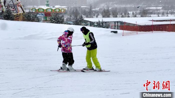 圖為滑雪教練協(xié)助臺胞青年進行滑雪訓練。王牧雨 攝