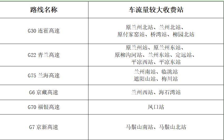 ?。ㄒ唬└咚俟分攸c(diǎn)路段。以蘭州為中心的放射線及其聯(lián)絡(luò)線為重點(diǎn)。如:G30連霍高速,G22青蘭高速,G6京藏高速,G70福銀高速,G75蘭海高速,S1機(jī)場高速等路段及相關(guān)收費(fèi)站、服務(wù)區(qū)。