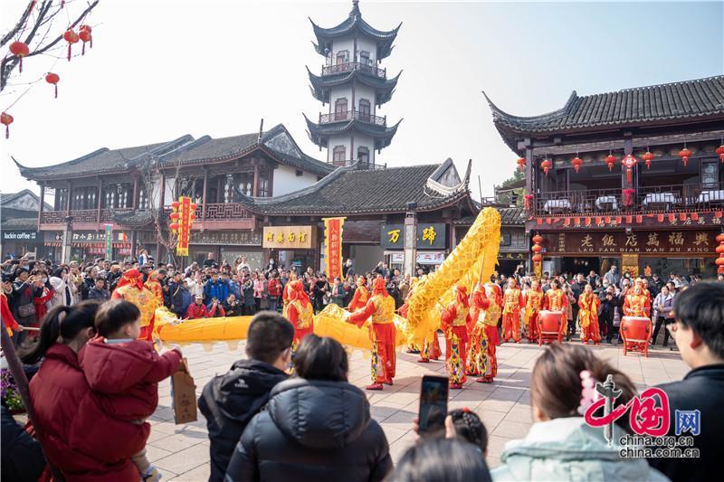 從古牌樓“打春牛”到財(cái)神居“迎財(cái)神”,從水巷“巡游”到老街“打連廂”,從傳統(tǒng)“舞龍舞獅”到創(chuàng)新“踩高蹺”,場(chǎng)場(chǎng)沾得龍行龘龘的好意頭。