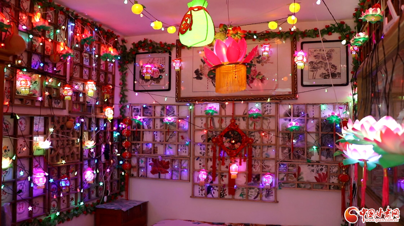 走進馬玉琳的家,精美的宮燈、雅致的荷花燈、喜慶的掛件、彩色的燈帶錯落有致地掛在木制格子架上,濃濃的年味兒撲面而來,數(shù)百盞彩色花燈同時點亮,將屋內裝扮成“滿房燈火迎新春”的喜慶景象。