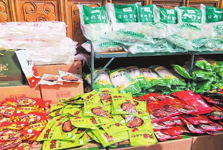 在城門(mén)入口的一個(gè)代銷(xiāo)店,各種包裝的麻辣燙底料、定西寬粉吸引了許多游客前來(lái)購(gòu)買(mǎi)。
