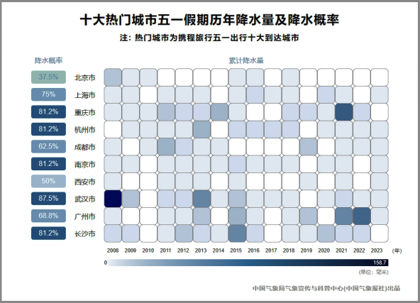 需要特別提醒的是,熱門城市中的廣州市雖然歷年降水量并不是特別大,但今年“五一”期間,華南地區(qū)還會延續(xù)前期雨水偏多的節(jié)奏,在五天假期的后半段將出現(xiàn)暴雨至大暴雨,去往廣州及周邊等地旅行,需及時關(guān)注當(dāng)?shù)貧庀蟛块T發(fā)布的預(yù)報預(yù)警,提前安排行程。