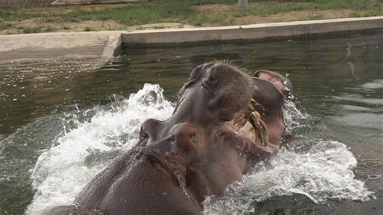 “小乖”今年正值青春活潑的年紀(jì),性格溫順可愛。經(jīng)過一段時間的精心準(zhǔn)備與適應(yīng)期,“小乖”已經(jīng)與老住戶“大嘴”和諧相處,一同在水中暢游、嬉戲玩耍,或是在岸邊悠閑進(jìn)食、曬著太陽。兩只河馬的互動與陪伴,給園區(qū)增加了許多樂趣,也給游客們帶來更加新奇、歡樂的觀賞體驗。