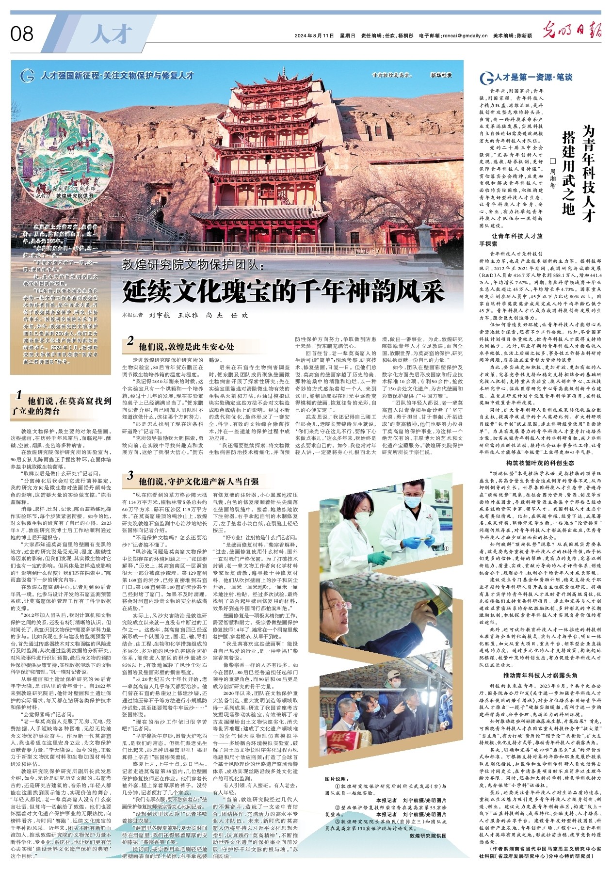 敦煌研究院保護研究所副所長武發(fā)思介紹,如今,無論是研究歷史文獻的、石窟考古的,還是研究古建筑的、音樂的,年輕人都能在這里找到展示能力、實現(xiàn)價值的舞臺,“年輕人都說,老一輩莫高窟人沒有什么豪言壯語,但卻將一切獻給了敦煌。他們也要懷揣著對文化遺產(chǎn)保護事業(yè)的無限熱忱,向榜樣看齊,與時間‘賽跑’,延續(xù)文化瑰寶的千年神韻風(fēng)采。近年來,團隊不斷有新鮮血液加入,推動敦煌研究院的文物保護力量不斷科學(xué)化、專業(yè)化、系統(tǒng)化,也讓我們更有信心去實現(xiàn)‘建設(shè)世界文化遺產(chǎn)保護的典范’這個目標。”
