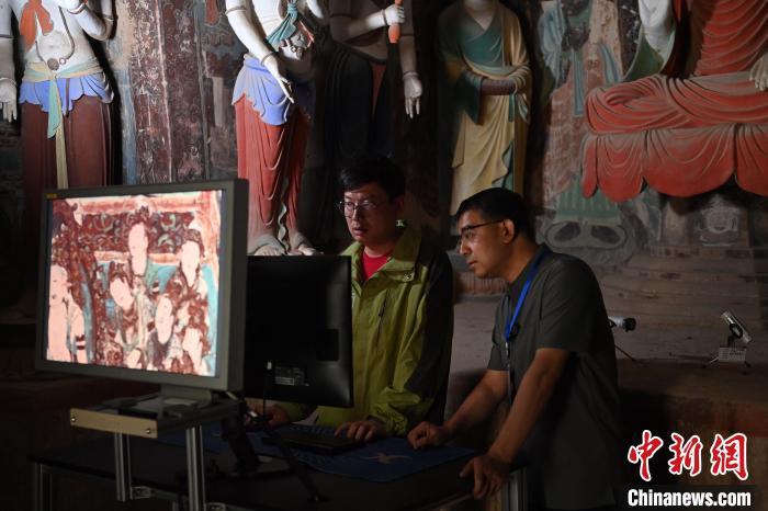 6月5日,敦煌莫高窟內(nèi),敦煌研究院文物數(shù)字化研究所工作人員進(jìn)行敦煌壁畫數(shù)字化圖像現(xiàn)場(chǎng)檢查工作。中新社記者 李亞龍 攝