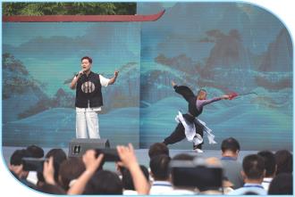 主詩會現(xiàn)場,氣勢恢弘的武術(shù)表演,精彩絕倫的拿手絕技,美輪美奐的崆峒山景,蕩氣回腸的武林唱響,組成一幅幅震天動(dòng)地的美麗畫卷。伴著《少林,少林》《中國功夫》的歌聲,中岳武校功夫表演團(tuán)數(shù)套行云流水的少林武術(shù),豪氣干云、笑逸蒼茫,一招一式古風(fēng)流存,展現(xiàn)出少林武者英雄豪杰的氣魄與豪邁,演繹了少林武魂的禪武精神。這些平常只能在電影或電視中才可以看到的少林武功,而今就在眼前,觀眾們紛紛報(bào)以熱烈掌聲。武與舞的“對話”,武與舞的“相遇”詮釋鐵血丹心、俠骨柔情。由平?jīng)鰫郯鹏嵛璧概嘤?xùn)中心帶來舞蹈《王母夜宴》,通過王母夜宴的歡樂場景,將西王母和周穆王相愛的神話故事深情講說,情濃處,千回百轉(zhuǎn),柔腸百結(jié)。一曲《刀劍如夢》穿越時(shí)空而來,歌手用獨(dú)特的嗓音,將這首歌演繹得淋漓盡致,將觀眾帶入了一個(gè)感性而深沉的氛圍,帶領(lǐng)我們回到了那個(gè)充滿江湖氣息的瑰麗世界。“滄海一聲笑,滔滔兩岸潮,浮沉隨浪只記今朝,蒼天笑,紛紛世上潮,誰負(fù)誰勝出天知曉滄海笑……”一曲《滄海一聲笑》,營造了一股濃濃的中國俠士逍遙風(fēng),旋律步步低落,先抑后揚(yáng),峰回路轉(zhuǎn),觀眾隨著音樂的意象一步步陷入蒼涼和寂寥中。隨著歌曲的高跌起伏,一個(gè)個(gè)精彩的片段定格為現(xiàn)場觀眾一張張手機(jī)影像。