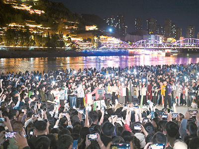 在黃河蘭州段近水平臺(tái),市民及游客參與蘭州黃河大合唱活動(dòng)。  新華社記者 范培珅攝