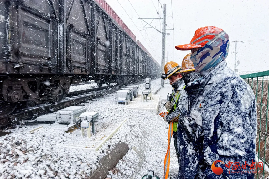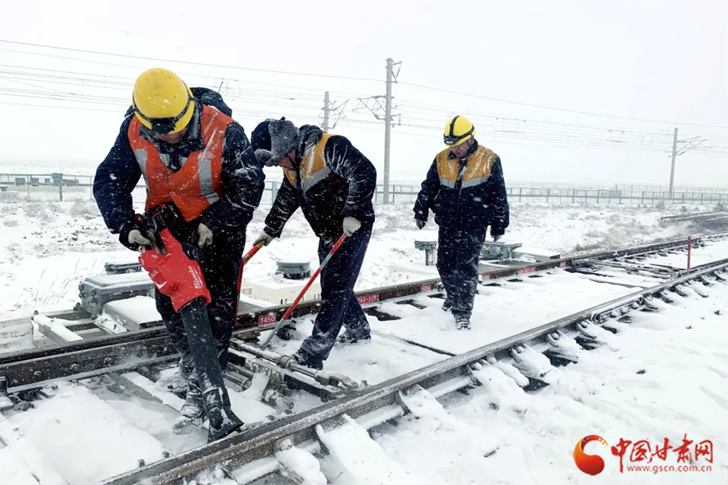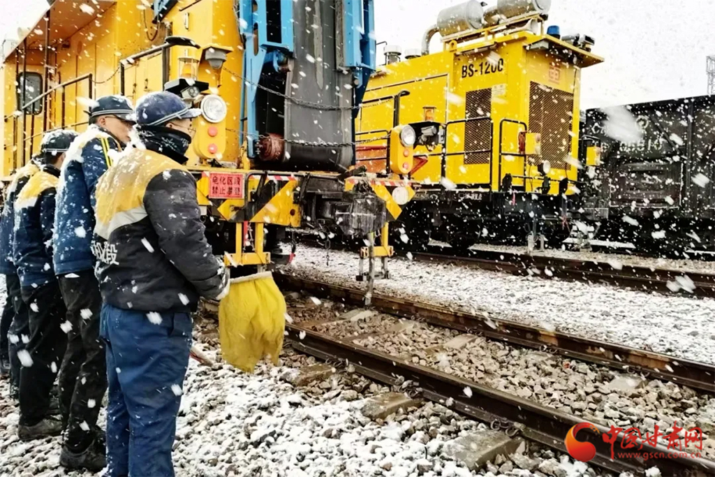 近日,受冷空氣影響,甘肅省古浪、山丹、永昌等地迎來降雪天氣。蘭州鐵路局各單位迅速啟動應(yīng)急預(yù)案,上下聯(lián)動、多措并舉迎戰(zhàn)風(fēng)雪,保障降雪天氣下運(yùn)輸安全暢通。(蘭州鐵路局供圖)