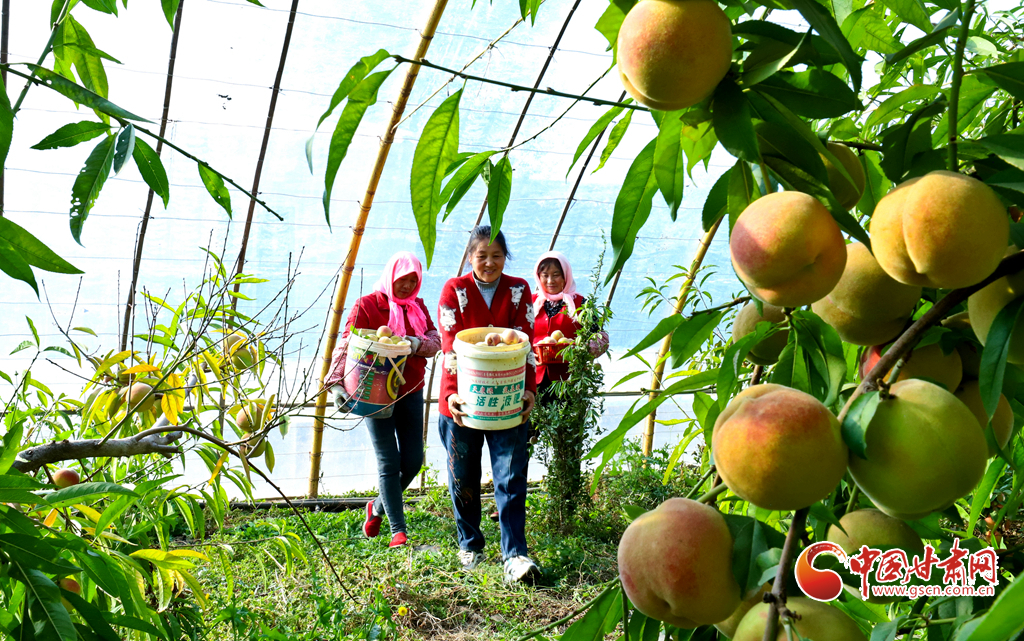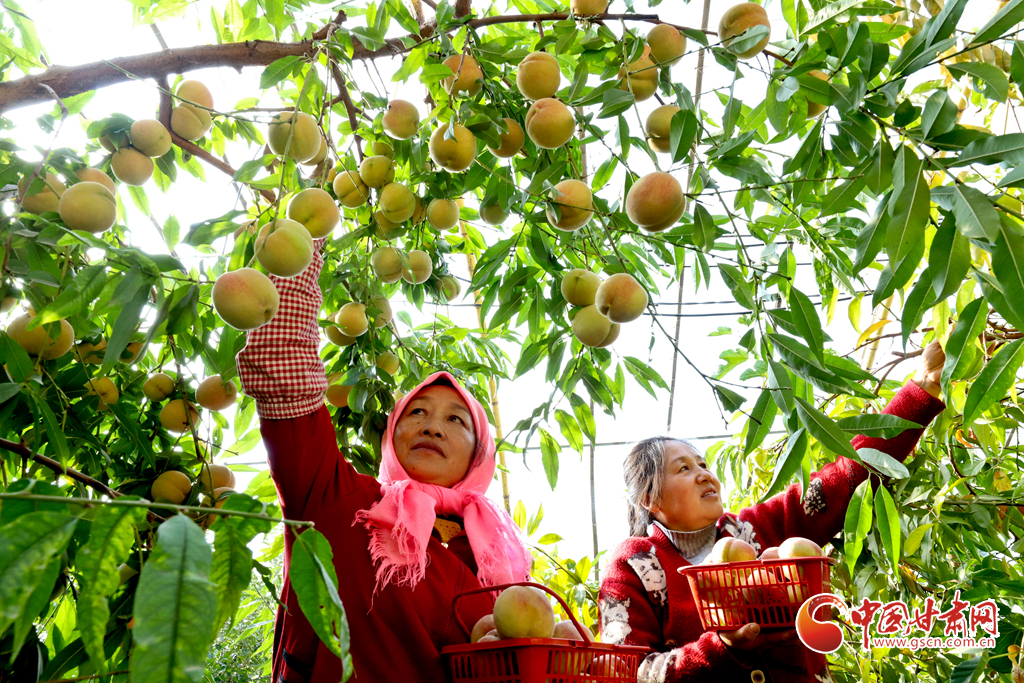 10月24日,在張掖市甘州區(qū)長安鎮(zhèn)萬通果蔬種植專業(yè)合作社“甘泉雪桃”種植基地大棚內(nèi),種植戶正在為甘肅蘭州和青海西寧的客戶采摘裝運“甘泉雪桃”。