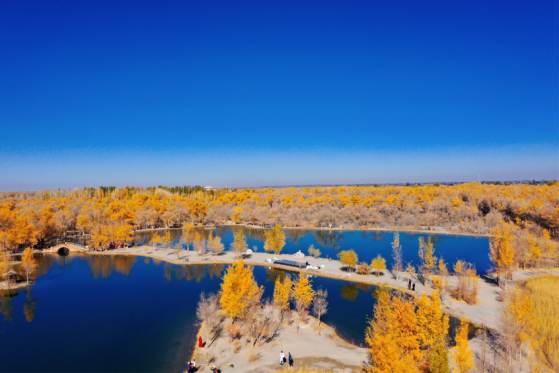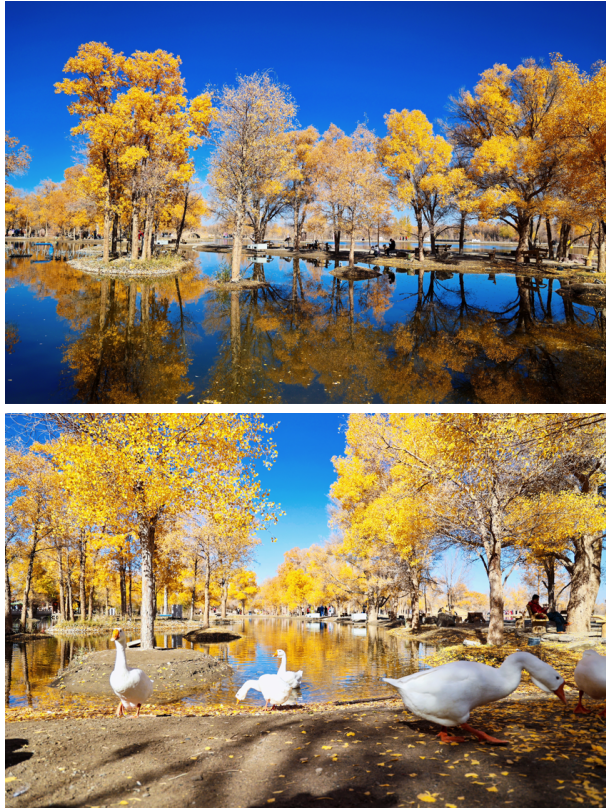 金波湖是金塔胡楊林的心臟,是臨水胡楊的最佳拍攝地之一。湖面倒映著胡楊高大的身影,多姿的樹(shù)干,黃色的樹(shù)葉,都毫不保留地在水中展示出來(lái)。小橋流水、碧波蕩漾、白鵝嬉戲,若不是周邊金黃色的胡楊提醒,會(huì)讓人誤以為來(lái)到了江南水鄉(xiāng)。