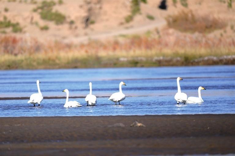 近日,高臺(tái)縣黑河濕地多次監(jiān)測(cè)到大天鵝種群,它們的翩翩降臨,標(biāo)志著天鵝一年一度的越冬之旅正式開啟。 大天鵝是雁形目鴨科天鵝屬鳥類,又稱黃嘴天鵝,全身潔白,僅頭稍沾棕黃色;喙黑色,上喙基部黃色,喙端黑色;跗跖、蹼、爪也為黑色,是國(guó)家二級(jí)保護(hù)動(dòng)物。天鵝對(duì)棲息地的選擇極為苛刻,它們的到來是高臺(tái)縣黑河濕地生態(tài)環(huán)境質(zhì)量?jī)?yōu)良的有力證明。