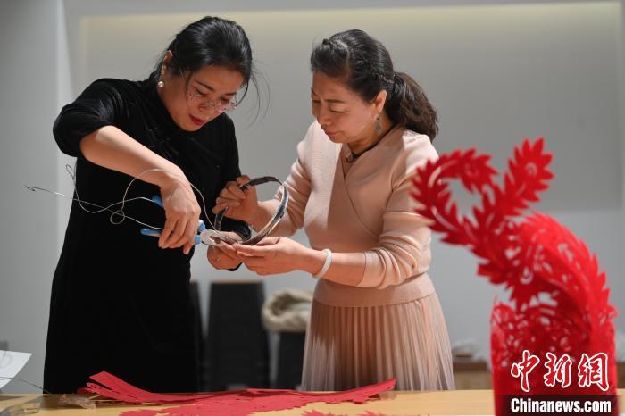11月23日,甘肅省蘭州市楊樹珍剪紙工作室內(nèi),楊樹珍(右)帶領(lǐng)團(tuán)隊(duì)成員制作剪紙漢服。中新社記者 李亞龍 攝