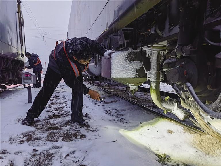 受今年入冬以來最強寒潮、雨雪天氣影響,11月23日20時開始,中國鐵路蘭州局集團有限公司蘭州西機務段調(diào)車車間擔當管內(nèi)的武威南、打柴溝等地區(qū)氣溫接近零下15℃,蘭新線蘭州北至武威南、蘭青線部分線路已普降中到大雪,調(diào)車車間干部職工以雪為令,精心組織、主動應對,采取有力措施最大限度降低不良天氣給行車安全帶來的影響,全力保證疆煤外運人員供應,確保列車安全暢通。