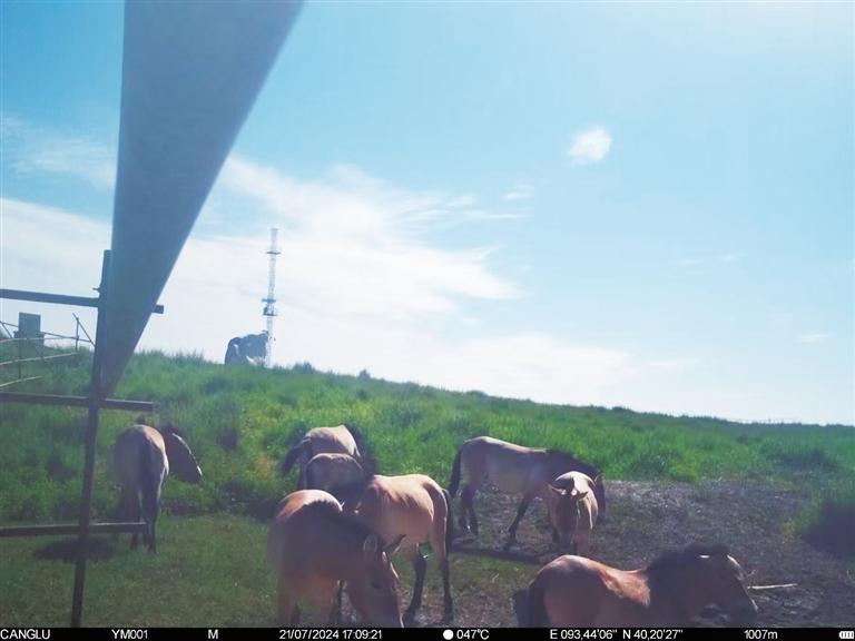 近日,甘肅敦煌西湖國家級自然保護區(qū)管護中心工作人員整理紅外相機拍攝畫面時,發(fā)現(xiàn)拍攝到普氏野馬“哺乳”的清晰影像。畫面拍攝于今年7月下旬,有8匹普氏野馬繁殖群正在馬圈灣濕地的飲水泉附近活動,其中有一匹小馬駒滿足地吸吮著母馬的乳汁。據(jù)監(jiān)測,該小馬駒出生于6月上旬,畫面中約已有一個半月大小,身體健康,毛色光亮。這個繁殖群領地范圍主要從馬圈灣西觀景臺至馬圈灣東高地,該區(qū)域可采食物種類豐富、水源充沛,是適合普氏野馬生活的美麗家園。普氏野馬是國家一級重點保護動物,常棲息于山地、草原和荒漠,性機警、善奔跑。近年來,隨著敦煌西湖保護區(qū)生態(tài)環(huán)境保護力度加大,生態(tài)環(huán)境質量持續(xù)改善,群眾保護野生動植物的意識不斷增強,使野生動物活動范圍不斷擴大,種群數(shù)量不斷增加。截至目前,敦煌西湖保護區(qū)內普氏野馬種群數(shù)量已達166匹。