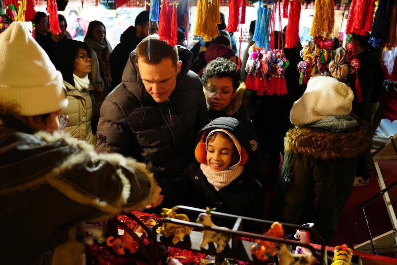 (法國(guó)巴黎圣誕集市慶陽(yáng)香包展位上,一位外國(guó)友人正在購(gòu)買(mǎi)心儀的“虎頭枕”香包。)