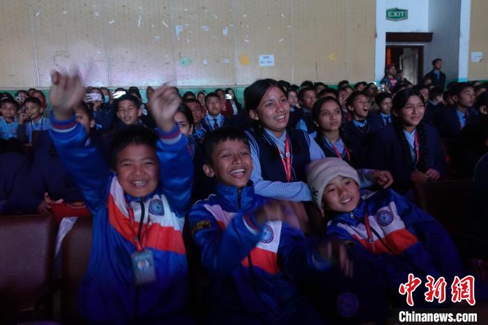 2月20日,中尼跨國新春文藝晚會在尼泊爾博克拉舉行,尼泊爾學(xué)生在聽到博克拉國際機場開通首條定期國際航線時歡呼雀躍?!≈行律缬浾?nbsp;崔楠 攝