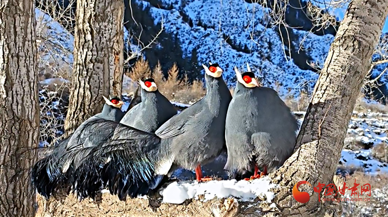 祁連秘境上演藍馬雞家族雪地“聚會”