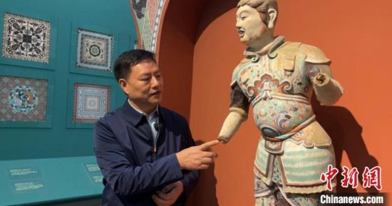 2023年2月,甘肅省蘭州市,汪萬福在敦煌藝術(shù)館向中新社記者介紹莫高窟第194窟南方增長天王塑像復(fù)制過程?!⊥跄劣?nbsp;攝