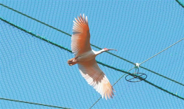 小隴山龍門林場朱鹮生態(tài)園中展翅翱翔的朱鹮。