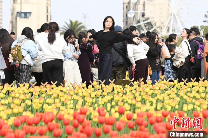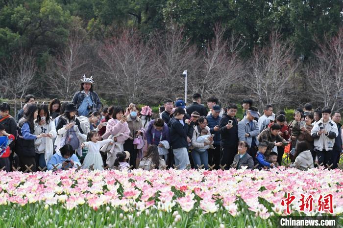 3月16日,位于湖南長沙的湖南省植物園數(shù)十萬株郁金香肆意綻放,五彩斑斕的花瓣交織成一片絢麗花海,引得眾多游人紛至沓來,享受愜意春日。圖為游人置身花叢中。中新社記者 楊華峰 攝