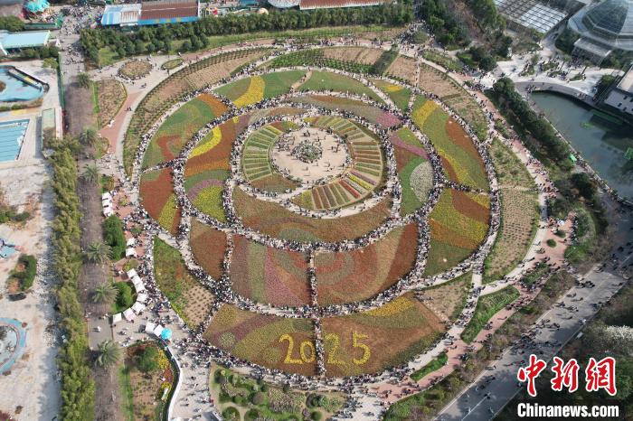 圖為游人來到巨型“玫瑰花型花海”中賞花。(無人機(jī)照片)中新社記者 楊華峰 攝