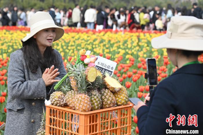 圖為商戶在花叢中進(jìn)行直播帶貨賣鳳梨。中新社記者 楊華峰 攝