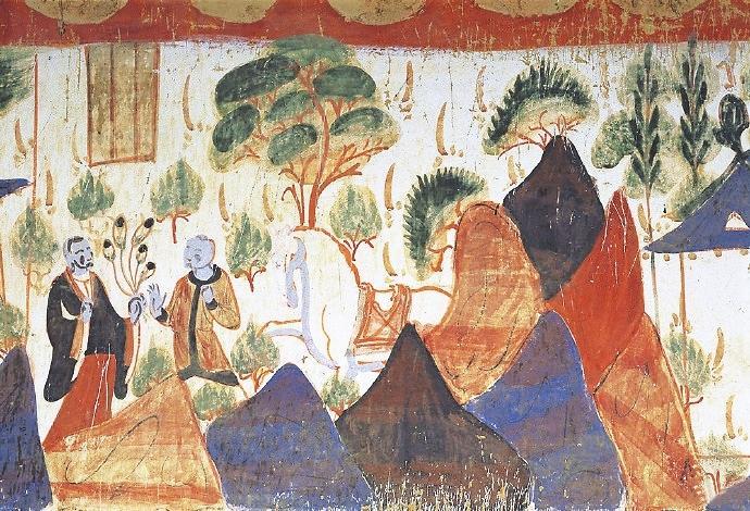 在敦煌壁畫(huà)中有關(guān)對(duì)弈的內(nèi)容較多。在莫高窟第454窟、第7窟壁畫(huà)中都有“弈棋圖”。兩幅圖的畫(huà)面有不少類(lèi)似的地方:一是畫(huà)師較為突出棋盤(pán)的位置,兩幅壁畫(huà)中的棋盤(pán)都居中且形制相對(duì)巨大;二是畫(huà)面上的人物均為三人,兩人對(duì)弈,一人觀戰(zhàn),“觀棋不語(yǔ)真君子”;三是對(duì)弈者身后的景色都是天朗氣清、遠(yuǎn)山含黛。據(jù)說(shuō),一天,北宋大文豪蘇東坡與摯友黃庭堅(jiān)正在松樹(shù)底下弈棋。一陣風(fēng)吹來(lái),松果掉進(jìn)棋盤(pán)。蘇東坡隨即吟道:“松下圍棋,松子每隨棋子落。”黃庭堅(jiān)馬上回答道:“柳邊垂釣,柳絲常伴釣絲懸。”雅趣十足。其實(shí),棋局里的一動(dòng)一靜、一招一式無(wú)不需要謹(jǐn)小慎微、穩(wěn)扎穩(wěn)打。而對(duì)弈時(shí)的當(dāng)斷則斷、示假隱真、有效合作等戰(zhàn)術(shù)不僅是對(duì)弈的智慧,也是人生的哲理吧。