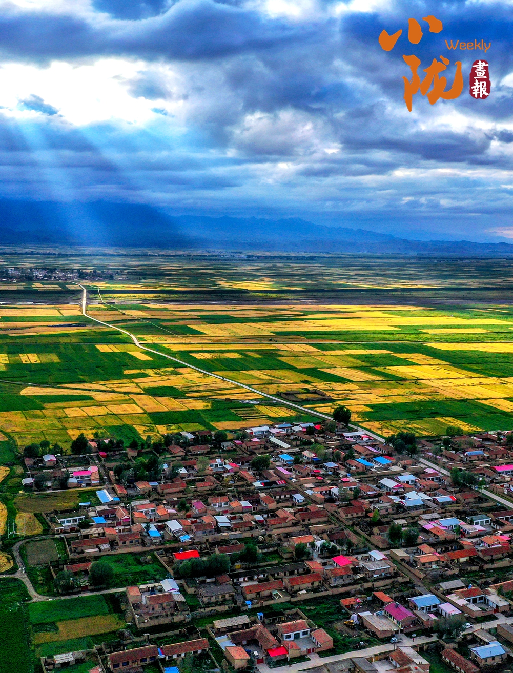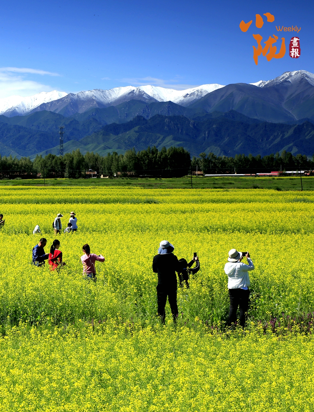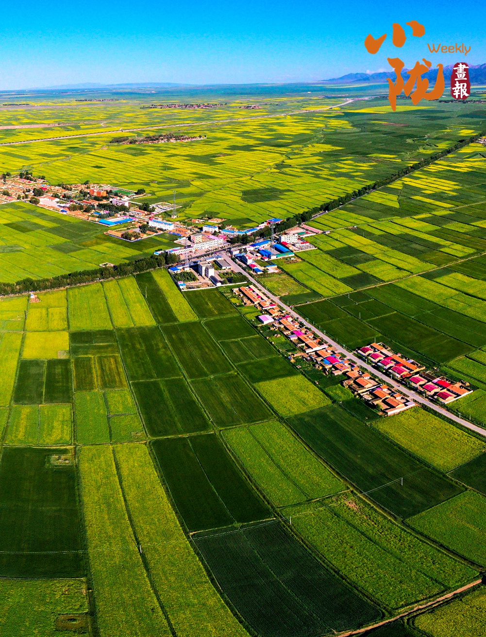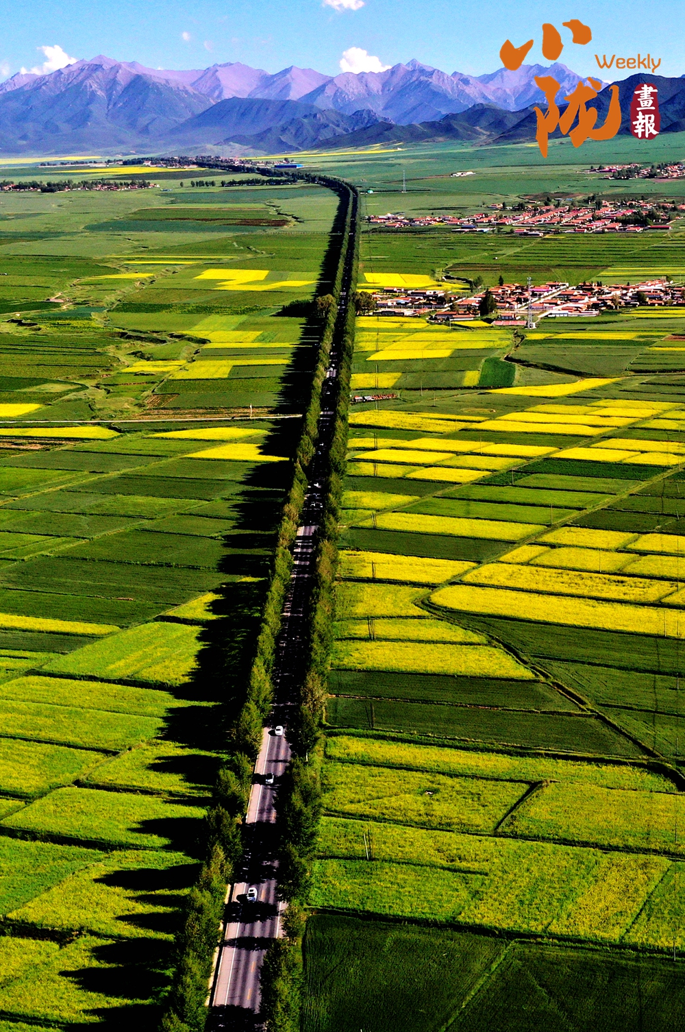 廣袤無邊的田野生機盎然,金黃色的油菜花夾雜著一塊塊碧綠色的麥田,好像給大地鋪上了一層五顏六色的大地毯。漂亮的民居鑲嵌其中,與祁連山相互輝映,在陽光下美麗極了!