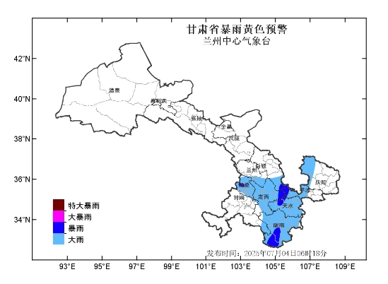 蘭州中心氣象臺(tái)2025年07月04日06時(shí)18分繼續(xù)發(fā)布暴雨黃色預(yù)警:過去24小時(shí)我省隴南市東部已出現(xiàn)大暴雨,最大降水量出現(xiàn)在武都裕河129.4毫米,預(yù)計(jì)未來12小時(shí)我省臨夏、定西、天水、隴南、平?jīng)龅戎菔胁糠值胤郊鞍足y市中南部、蘭州市南部、慶陽市北部、甘南州東南部有大雨,其中隴南市南部、天水市西部,定西市東部、平?jīng)鍪形鞑?、白銀市南部、臨夏州西部有暴雨,最大累計(jì)雨量60-90毫米,強(qiáng)降水將持續(xù)至4日17時(shí),最大小時(shí)雨強(qiáng)可達(dá)20-50毫米。請注意防范強(qiáng)降水可能引發(fā)的中小河流洪水、城鄉(xiāng)積澇、山洪、滑坡和泥石流等次生災(zāi)害。