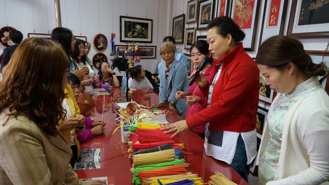 (唐彩萍在安曼為約旦王妃和公主及嘉賓現(xiàn)場(chǎng)制作麥稈畫(huà))