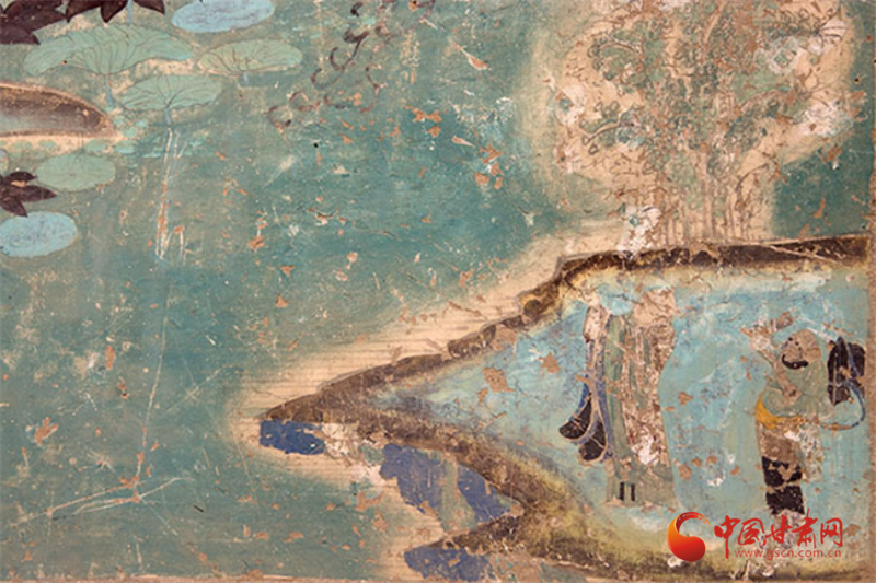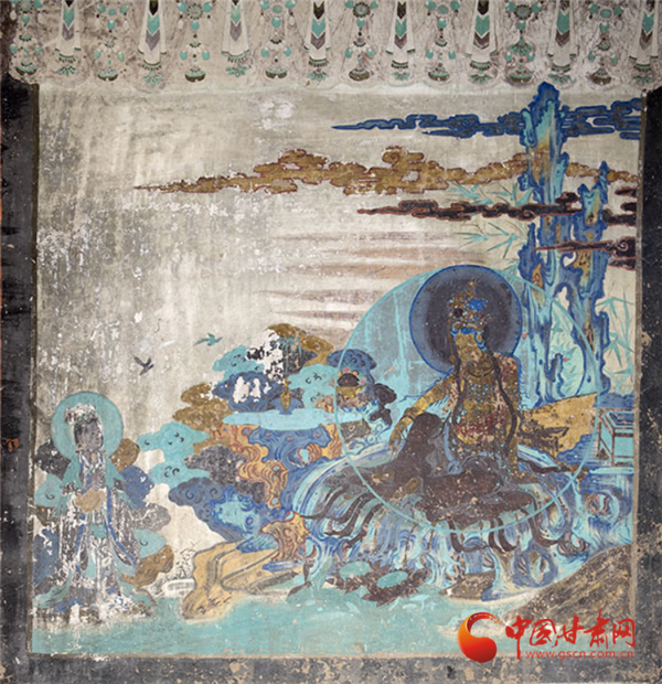兩幅作品均以青綠色調(diào)為主,觀音面部貼金雖已氧化,卻仍顯清新淡雅,更以“馬一角、夏半邊”的構(gòu)圖巧思,用對(duì)角線分割畫面、大量留白,讓有限的壁面生出無窮空間感,堪稱中國傳統(tǒng)美學(xué)與佛教哲理的完美融合——正如唐代白居易贊水月觀音“凈淥水上,虛白光中”,這般意境在榆林窟的壁畫里被演繹得淋漓盡致。