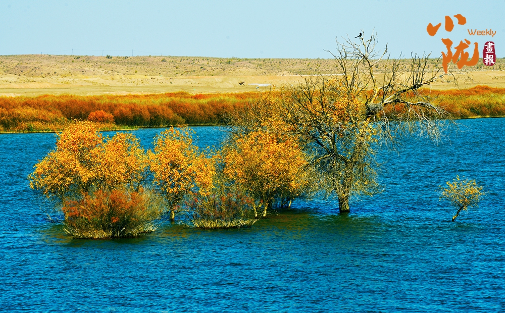 天藍(lán)藍(lán),水藍(lán)藍(lán),水天一色。紅柳簇?fù)沓裳?,燃燒在水中央,顯得格外奪目,展現(xiàn)出荒漠特有的壯美與生機(jī)。
