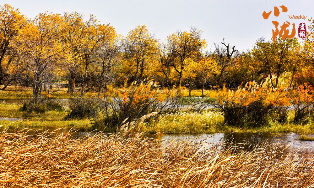 金色胡楊在陽光下泛著溫暖光澤,斑斕絢麗的蘆葦如金色絲帶點(diǎn)綴荒漠,與碧綠河水、湛藍(lán)天空構(gòu)成濃墨重彩的秋日?qǐng)D景。