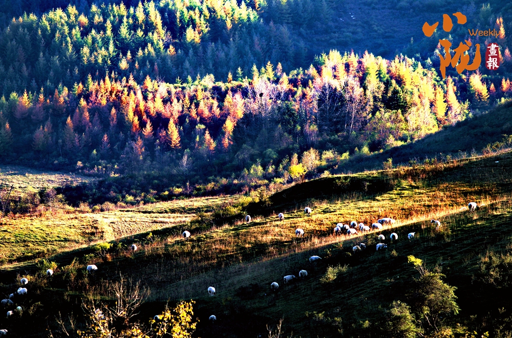 山川被染成一片耀眼的金黃,宛如大地披上了柔軟的絨毯。一群群牛羊散落其中,如同大地寫下的詩(shī)句,一行行、一段段,在彩色的大地上書寫著屬于自然的韻律。
