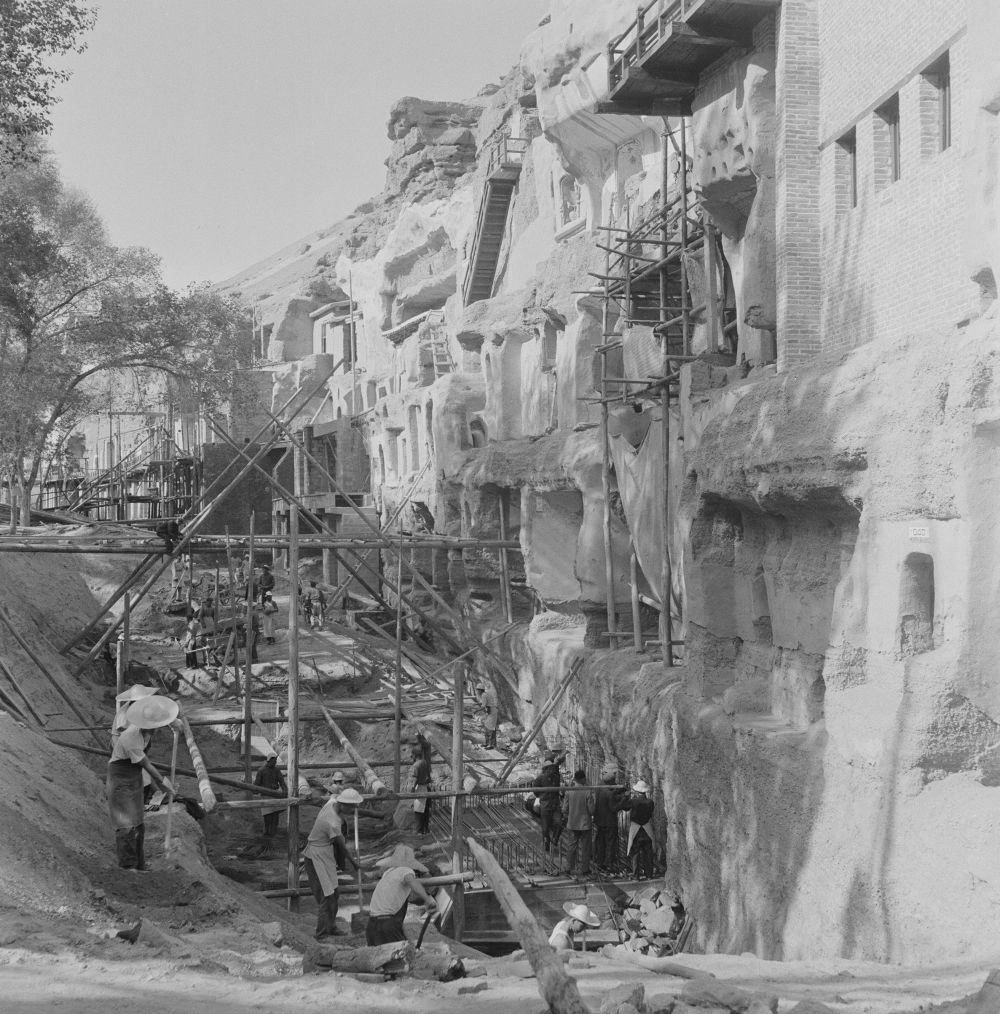 敦煌研究院工作人員對莫高窟部分洞窟進(jìn)行加固施工(1964年7月8日攝)。新華社發(fā)