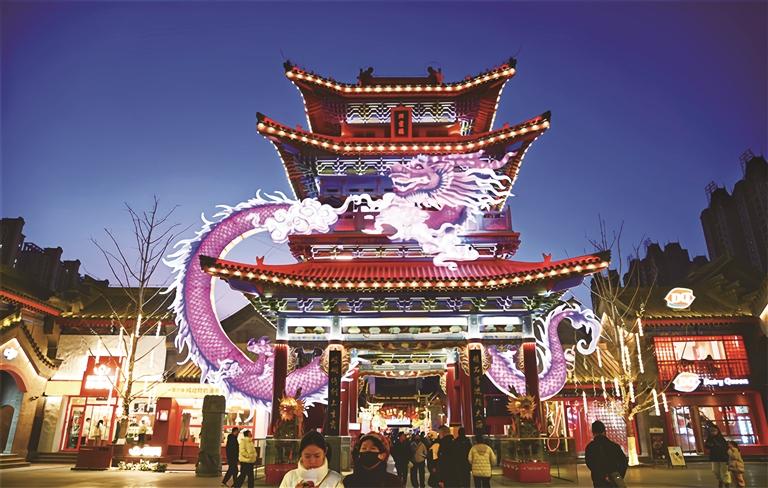 沿著青石板路前行,高達(dá)數(shù)米的“祥龍瑞躍”主燈組璀璨奪目;緊隨其后的“天驥呈祥”“花簇錦年”“福運(yùn)財(cái)神”等主題燈組依次鋪陳,仿佛將吉祥與喜慶灑滿街巷。老街外圍的現(xiàn)代燈陣不停變換,張掖丹霞的瑰麗、黃河波濤的壯闊,在光影中流轉(zhuǎn)成甘肅的壯美詩(shī)篇。