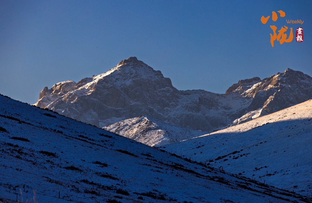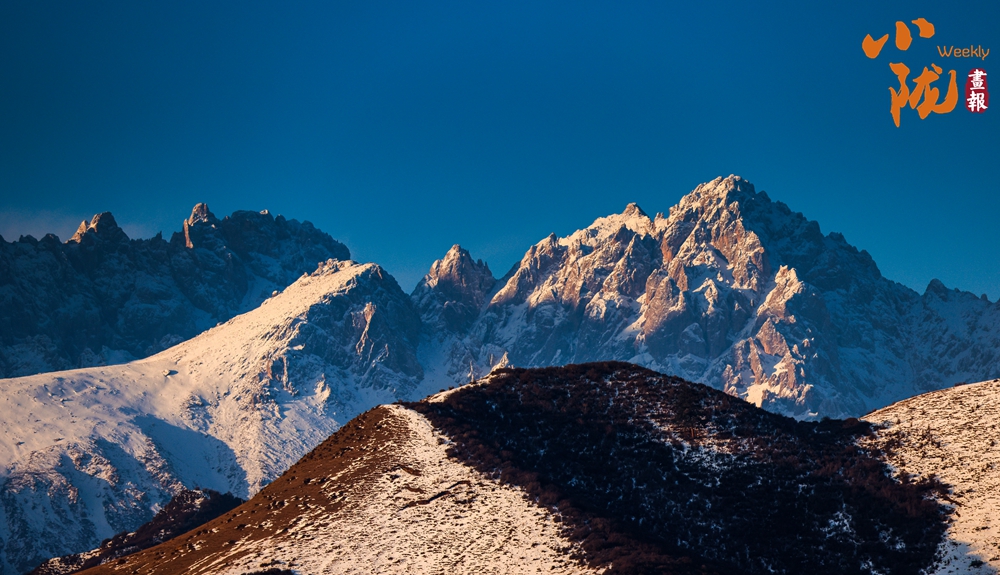 霞光沿著陡峭的山體徐徐蔓延,把寒光凜凜的積雪暈染成溫厚的琥珀色澤。天穹是沉靜的湛藍,雪山則如一件精心鍛造的鎏金藝術(shù)品懸于其間——山腰以下浸入蒼茫暮色,峰巔之上仍燃燒著最后的輝煌。