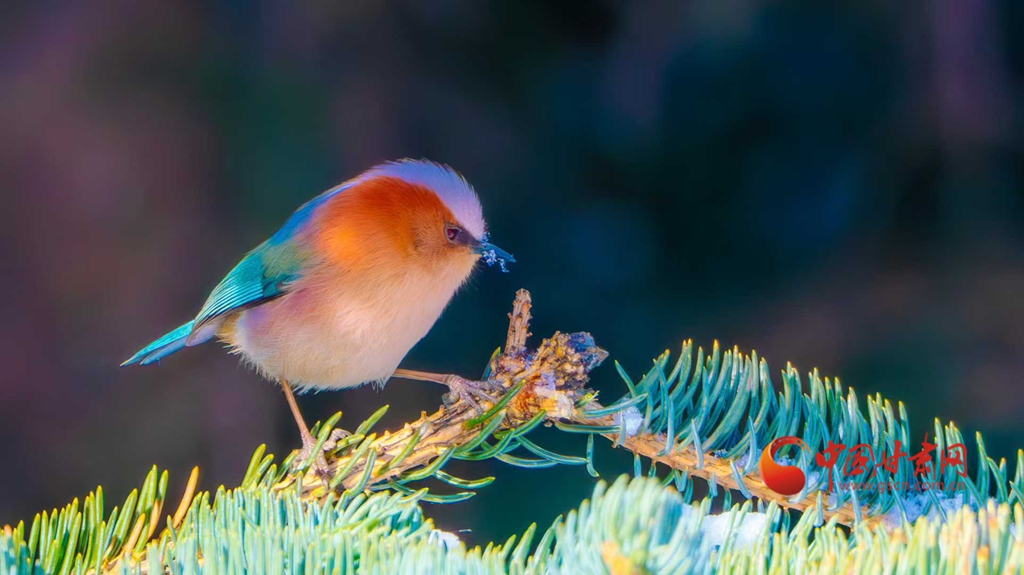 這群被譽為“祁連山精靈”的小鳥,頭頂雪白羽冠蓬松如絨,仿佛戴上了一頂天然的小絨帽,棕紅面頰溫潤似玉,在陽光下泛著柔和的光澤,藍綠背羽如同上好的寶石,在雪色映襯下泛著金屬般的質(zhì)感。淡粉與橙白相間的腹羽柔和雅致,層次分明,在純白背景的映襯下,形成強烈而和諧的視覺碰撞,它們或亭亭立于覆雪松枝,或靈巧穿梭于松針間隙,更有靈動的個體俯身探喙,啄取松針縫隙里的昆蟲,一聲輕脆的啄擊,劃破林間的清寂,卻更顯山野幽靜,羽翼輕振間,將“雪中覓食”的鮮活圖景永久定格。