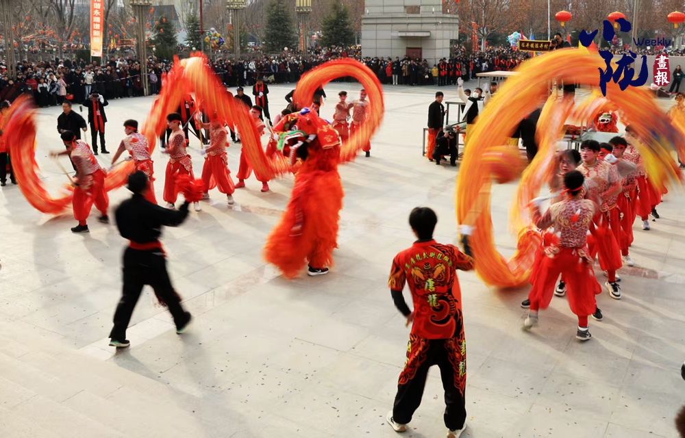 兩條金龍翻江倒海,踏著鼓點(diǎn)蜿蜒游走。舞龍的小伙子們步伐矯健,巨龍?jiān)谒麄兊氖种袝r(shí)而盤旋昂首,時(shí)而穿梭遨游,龍身隨著龍珠上下起伏,氣勢雄武遒勁。