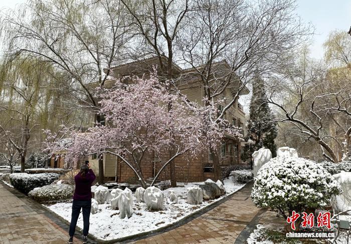 3月14日,蘭州主城區(qū)迎來降雪,市民拍攝雪景。中新社記者 丁思攝