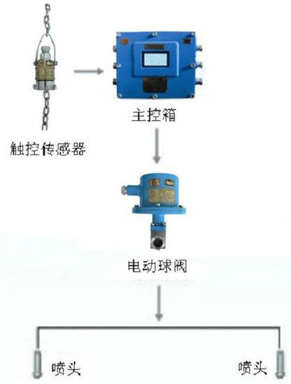 當(dāng)皮帶運(yùn)輸機(jī)輸煤時(shí),煤流觸動(dòng)傳感器探桿,觸控傳感器接收到信號(hào)觸發(fā)主控箱控制電路,打開電動(dòng)球閥,裝置自動(dòng)灑水降塵,無(wú)物料時(shí)延時(shí)一段時(shí)間后停止噴霧(延時(shí)可調(diào))。